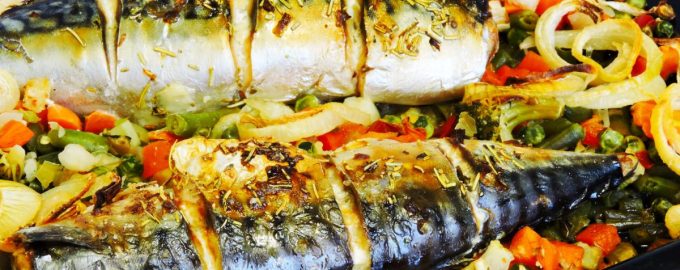 Σκουμπρί στο φούρνο με καρότα και κρεμμύδια